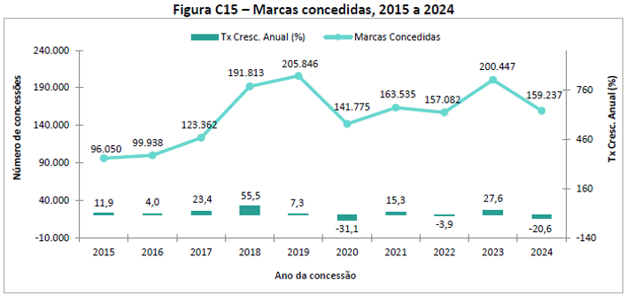 Despite this decline, the total number of active registrations reached 2,636,248 as of December 31, 2024 — the highest level ever recorded. More than 58% of these registrations were granted between 2015 and 2024, demonstrating the consolidation of trademark protection as a long-term strategy among Brazilian businesses.