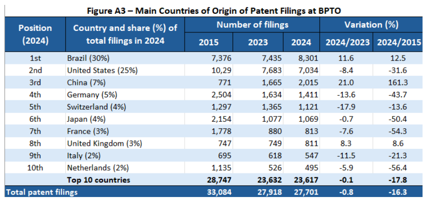 In 2024, Brazil became the leading country of origin for patent filings at the BPTO, accounting for 30% of total applications and surpassing the United States (25%) for the first time.